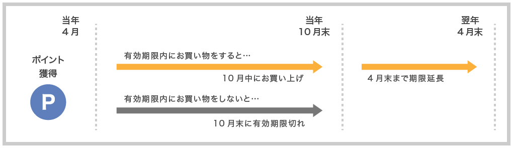 例)当年4月1日に製品を購入しポイントを獲得した場合、ポイントの有効期限は当年10月31日となりますが、当年10月31日までに製品を購入し、新たにポイントを獲得した場合、前回所持ポイントを含め、さらに6ヵ月後の月末まで有効期限が延長されます。